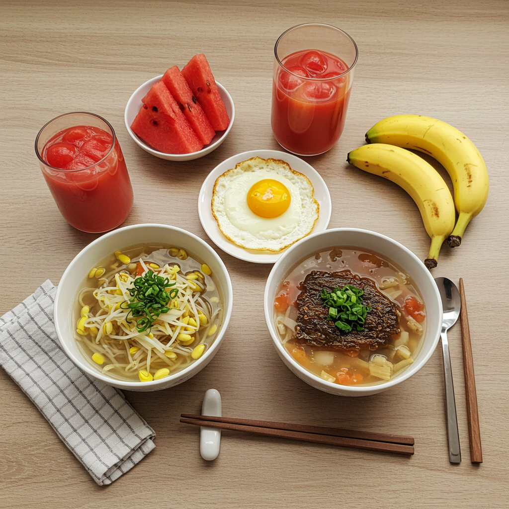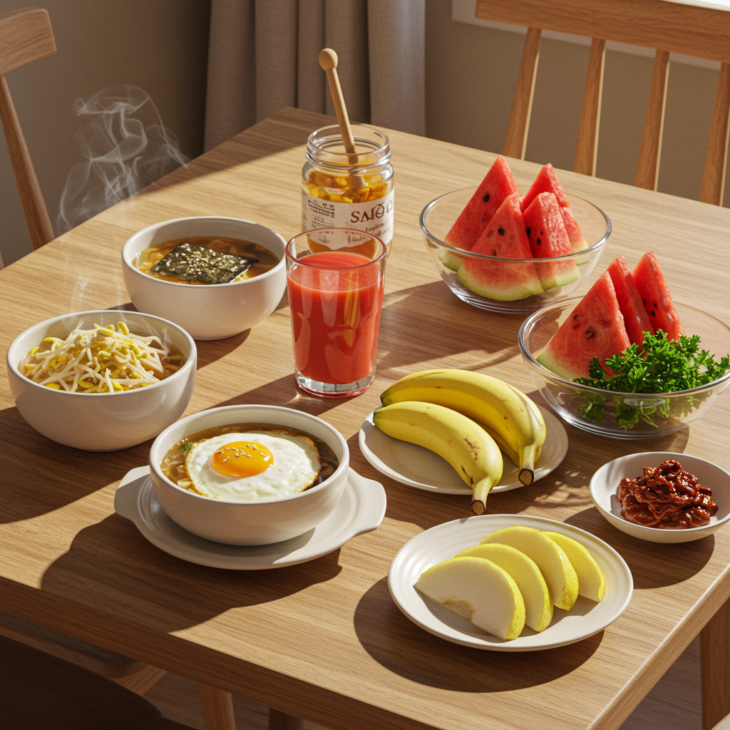 아침에는 콩나물국과 달걀프라이, 점심에는 북어국이나 된장국을 선택하고, 간식으로는 바나나와 수박을 챙기면 좋다. 저녁에는 토마토 샐러드나 미나리무침으로 가볍게 마무리하면 하루 종일 피로가 덜하다. 수분 보충을 위해 물을 자주 마시고 , 꿀물이나 배즙을 곁들이면 회복이 빠르다.